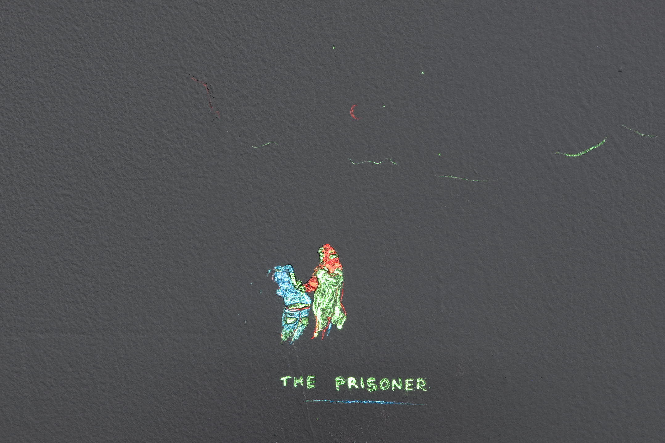 UV-phosphorescent pigments painted on a wall debris. UV portable flashlight.
