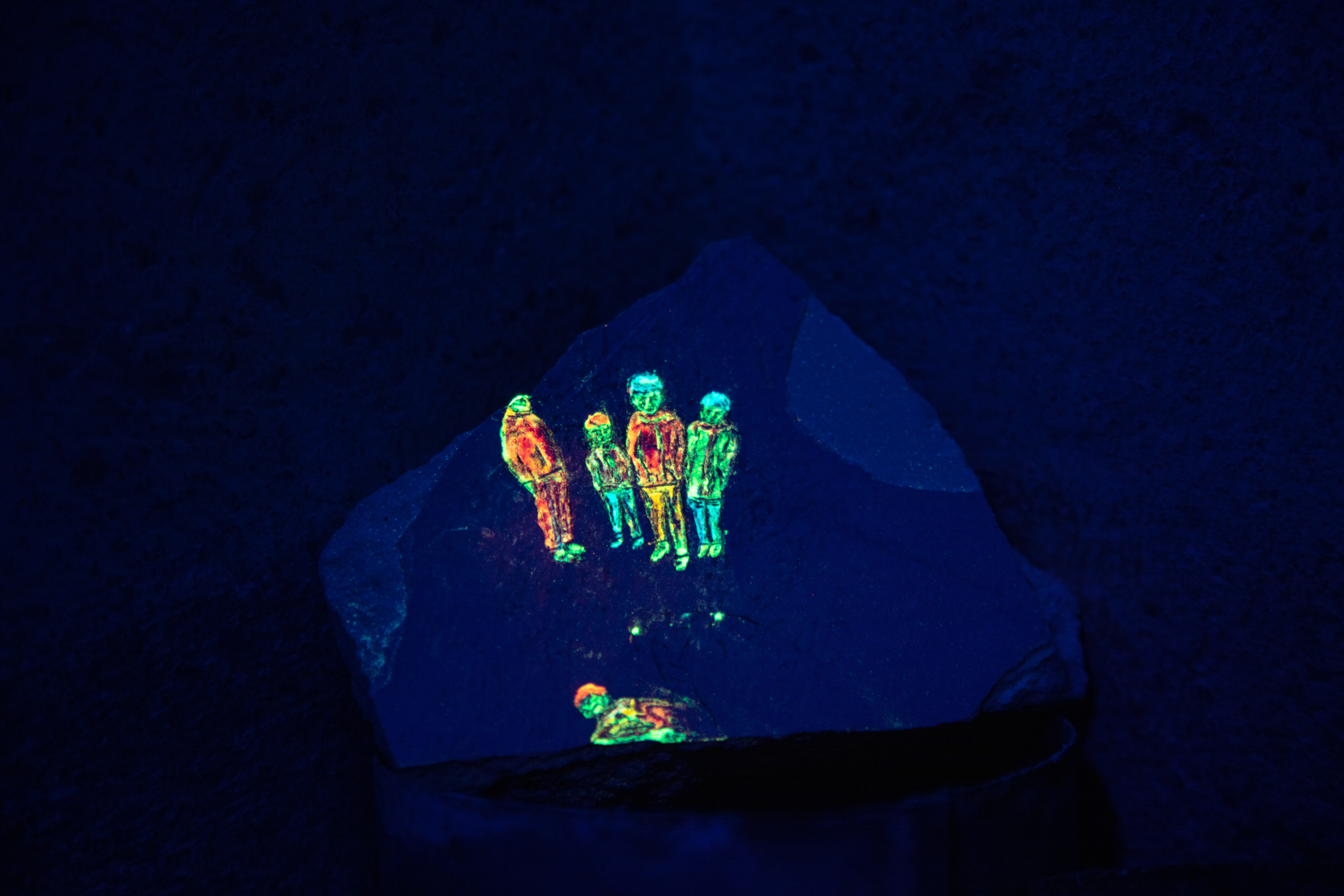 Phosphorescent pigments on several wall fragments. Portable UV flashlights